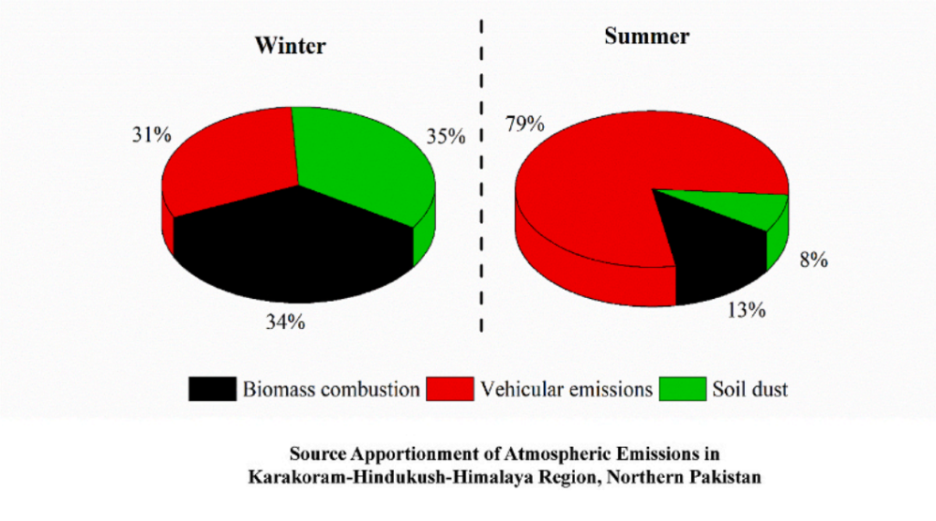 Figure 1. Seasonal source apportionment of Atmospheric Emissions in Karakorum-Hindukush-Himalaya Region, Northern Pakistan ( source: Adapted from a regional atmospheric emissions study in Northern Pakistan)