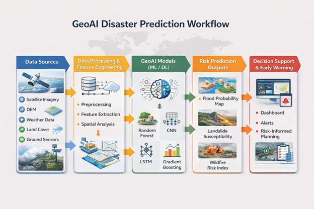 Disasters do not occur by chance. Instead, they have been constant risks, which have become worse due to climate change and anthropogenic activities. GeoAI has the ability to change the paradigm from reactive responses to proactive risk anticipation, mitigation, and prevention. The system has the ability to predict with greater accuracy the risks of disasters by analyzing spatial, environmental, and dynamic patterns. GeoAI systems can enable societies to stay one step ahead of emerging risks.